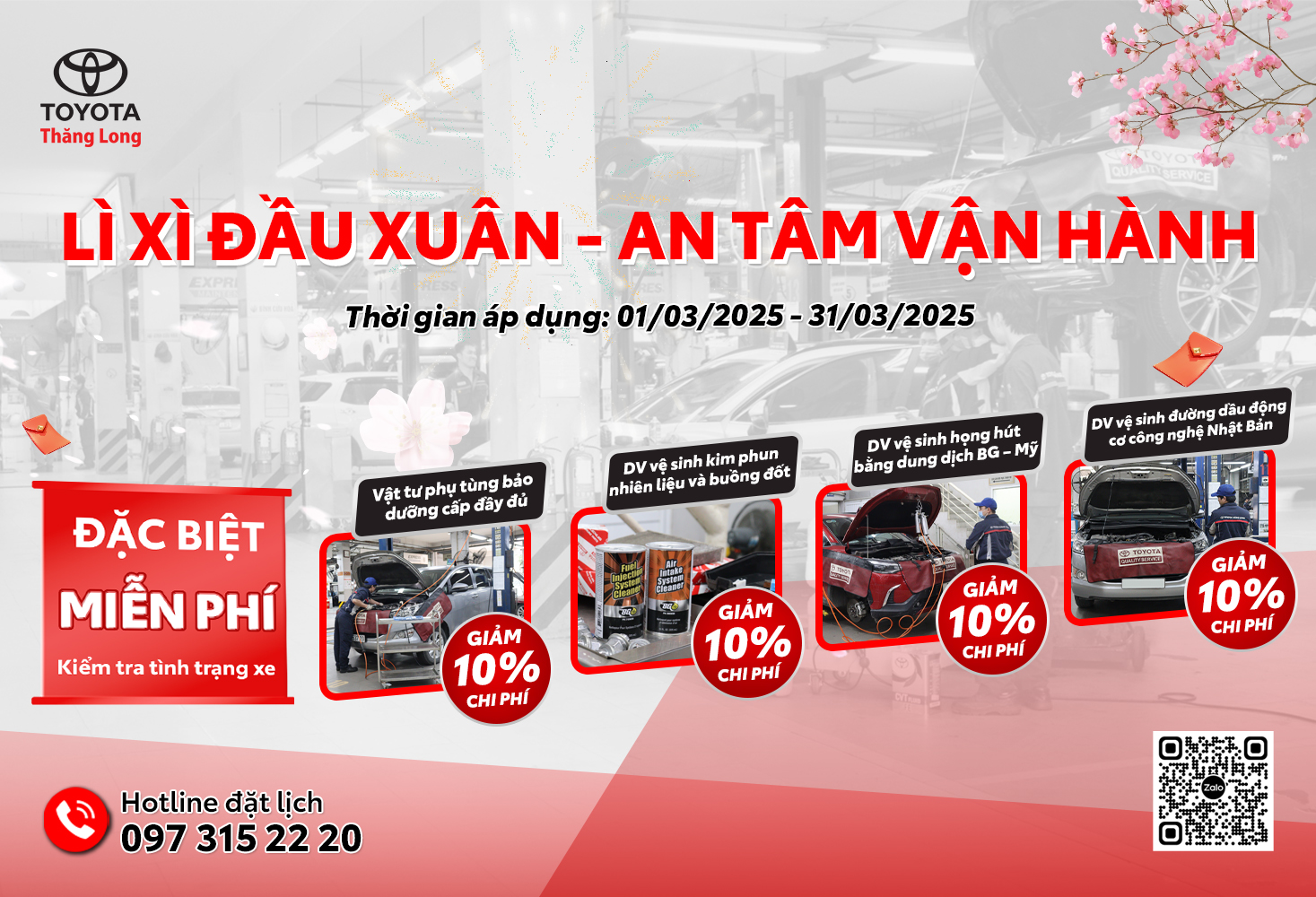 Cảm ơn Quý Khách hàng đã luôn yêu quý và lựa chọn dịch vụ của Toyota Thăng Long, như một lời tri ân ngọt ngào, Toyota Thăng Long trân trọng gửi đến Quý khách hàng chương trình khuyến mãi dịch vụ” BẢO DƯỠNG LIỀN TAY NHẬN NGAY ƯU ĐÃI”: