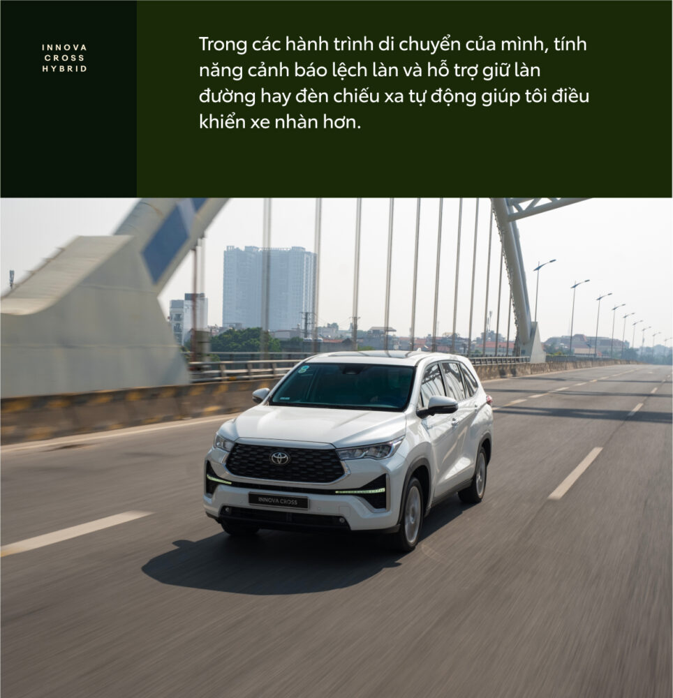An toàn cũng là một trong những điều đầu tiên tôi cân nhắc khi mua xe, bởi đơn giản “còn người là còn của”, di chuyển nhiều, đi cả đại gia đình, thì xe an toàn là yên tâm nhất. Innova Cross hybrid đáp ứng hết mọi đòi hỏi khắt khe đó của tôi với hệ thống an toàn tiên tiến nhất Toyota Safety Sense (TSS) bên cạnh cảnh báo điểm mù BSM, cảnh báo phương tiện cắt ngang phía sau RCTA hay camera 360 độ toàn cảnh cũng như hàng loạt tính năng an toàn chủ động, bị động khác. Đừng nghĩ rằng, bạn lái xe giỏi là không bao giờ để tai nạn xảy ra, cuộc sống luôn có những bất trắc mà bạn không thể ngờ tới được.