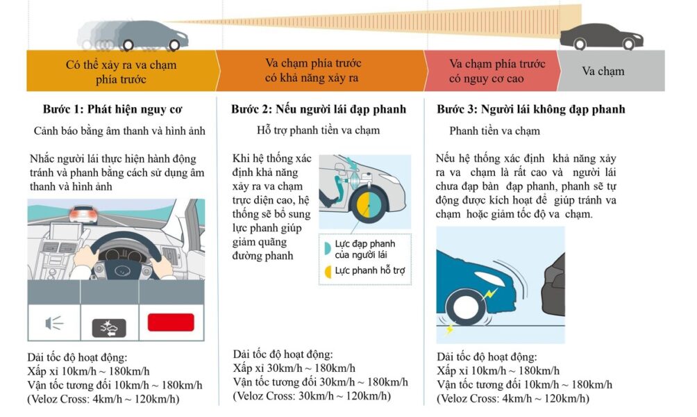 Giúp người lái xe tránh va chạm với các phương tiện khác phía trước Hệ thống phát hiện va chạm có thể xảy ra với các phương tiện, vật thể, người đi bộ phía trước và cảnh báo người lái nếu có nguy cơ va chạm, đồng thời kích hoạt phanh hỗ trợ khi người lái đạp phanh. Nếu người lái không đạp phanh, hệ thống sẽ chủ động kích hoạt chế độ phanh tiền va chạm để tránh hoặc giảm thiểu thiệt hại do va chạm khi khả năng xảy ra va chạm là cao. |