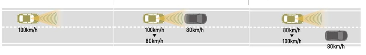 Hệ thống nhận diện xe phía trước nhờ các cảm biến ra da và camera phía trước và sẽ điều chỉnh, duy trì tốc độ đặt trước cũng như khoảng cách thích hợp với xe phía trước tùy theo tốc độ xe. |