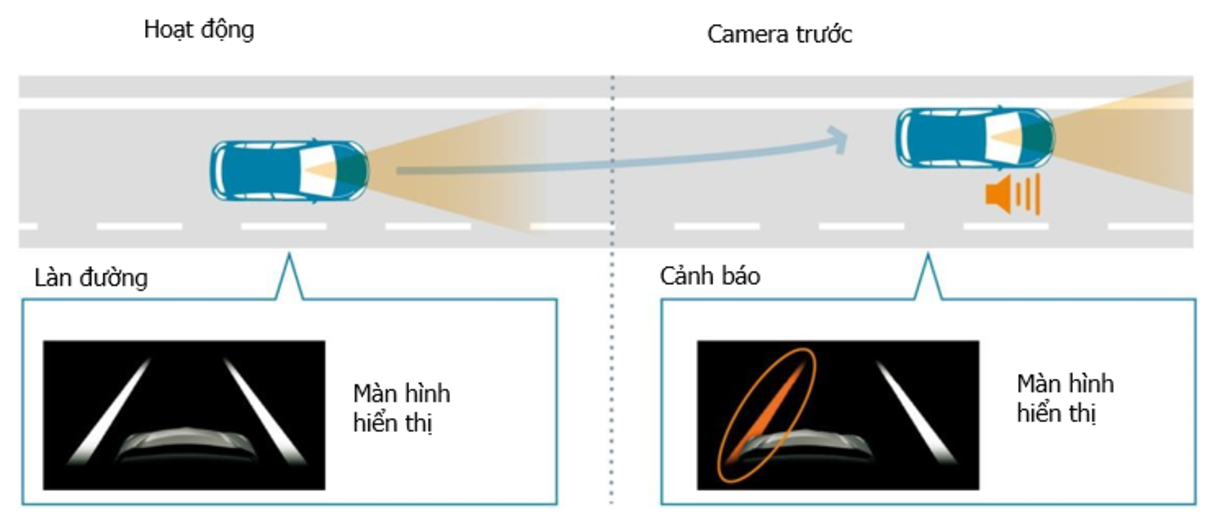 - Nếu hệ thống phát hiện xe bắt đầu đi chệch khỏi làn đường, hệ thống cảnh báo người lái với âm thanh và hình ảnh.