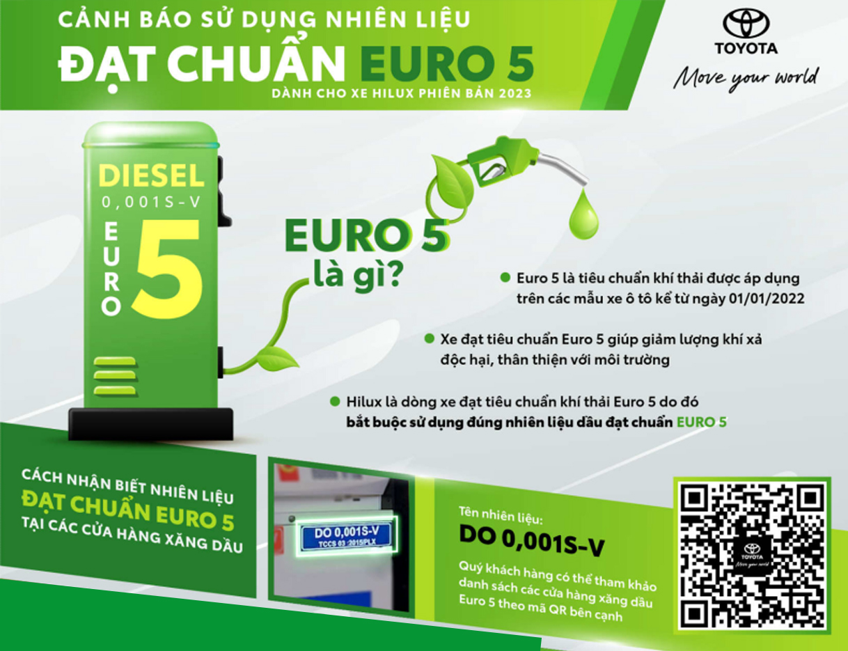 Trong lần trở lại này, Toyota Việt Nam đặc biệt khuyến cáo khách hàng sử dụng dầu DO 0,001S-V, nhiên liệu dầu đạt chuẩn Euro 5. Hãng cung cấp một mã QR để khách hàng chủ động tìm kiếm danh sách các cửa hàng cung cấp loại dầu đạt chuẩn.