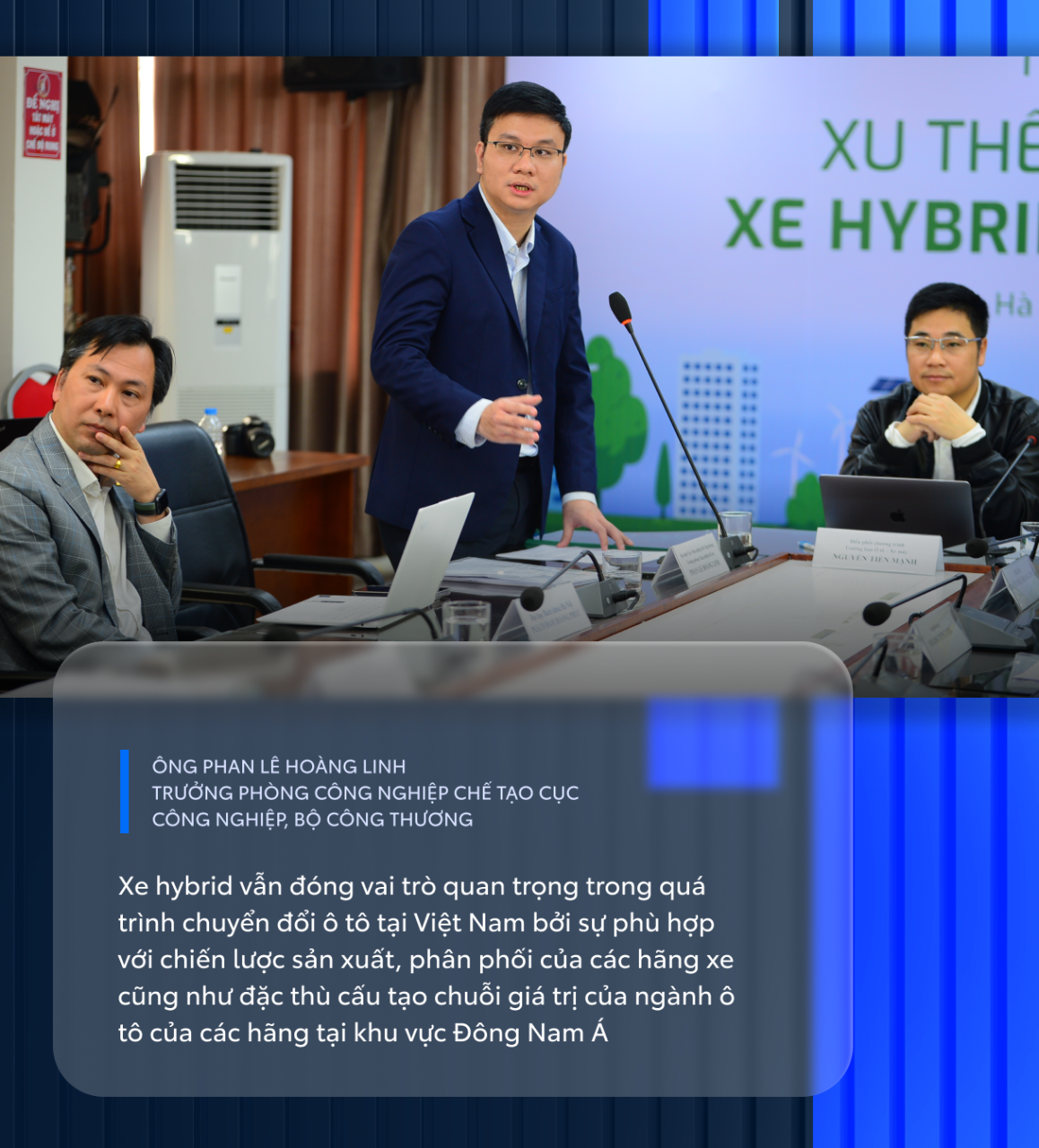 Đại diện cho Cục Công nghiệp, Bộ Công Thương, ông Phan Lê Hoàng Linh – Trưởng phòng Công nghiệp chế tạo cho biết: “Xe hybrid vẫn đóng vai trò quan trọng trong quá trình chuyển đổi ô tô tại Việt Nam bởi sự phù hợp với chiến lược sản xuất, phân phối của các hãng xe cũng như đặc thù cấu tạo chuỗi giá trị của ngành ô tô của các hãng tại khu vực Đông Nam Á”. Ông Hoàng Linh cũng cho biết thêm, để đạt được mục tiêu đưa phát thải ròng về 0 vào năm 2050 theo cam kết của Chính phủ tại COP26 và COP28 cần rất nhiều nguồn lực, quyết tâm, thời gian và quan trọng là đảm bảo hệ thống điện vận hành điều độ và ổn định để tiến tới tương lai sử dụng phần lớn năng lượng tái tạo. Trong quá trình đó, xe hybrid vẫn đóng vai trò quan trọng khi Việt Nam chưa có điều kiện chuyển đổi năng lượng để phát triển xe thuần điện.