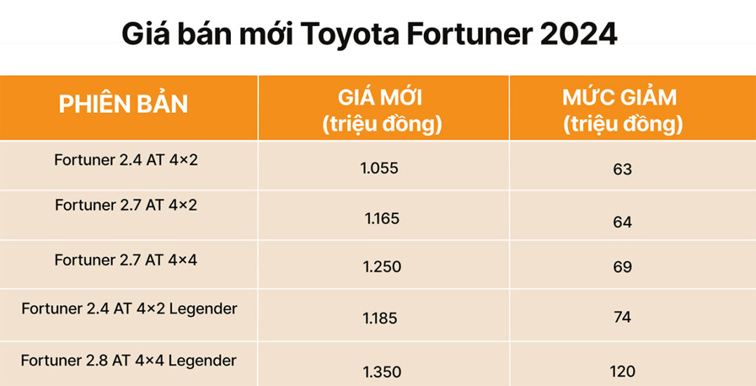 Không dừng lại ở nâng cấp trang bị và động cơ, đánh giá bối cảnh kinh tế năm 2024 và nhu cầu của khách hàng, Toyota Việt Nam điều chỉnh giá bán Fortuner, giảm từ 63 – 120 triệu đồng, tùy phiên bản.