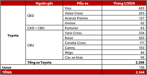 Công ty Ô tô Toyota Việt Nam công bố tổng doanh số bán hàng trong tháng 1/2024 đạt 2.344 xe (bao gồm xe Lexus).