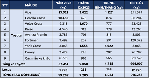 – Về bán hàng, năm 2023, Toyota Việt Nam đạt doanh số 59.207 xe (bao gồm Lexus), nâng tổng doanh số tích lũy đạt trên 916.000 xe. Trong đó, thương hiệu Lexus đạt doanh số kỷ lục kể từ khi ra mắt với 1.793 xe, nâng tổng số xe tích lũy lên hơn 12.000 xe.