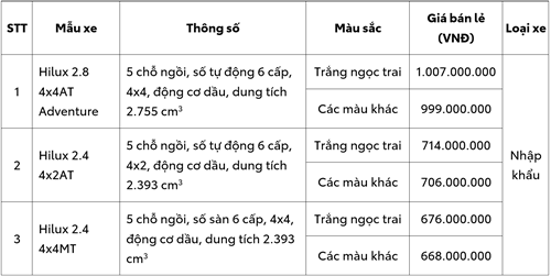 Mẫu xe Hilux 2024 được nhập khẩu từ Thái Lan với 6 màu sơn ngoại thất (Trắng ngọc trai, Bạc, Xám, Đen, Đỏ, Xanh) và sẽ có mặt tại hệ thống đại lý của Toyota trên toàn quốc từ ngày 14/05/2024. Thông tin chi tiết về sản phẩm và mức giá bán lẻ cụ thể như sau: