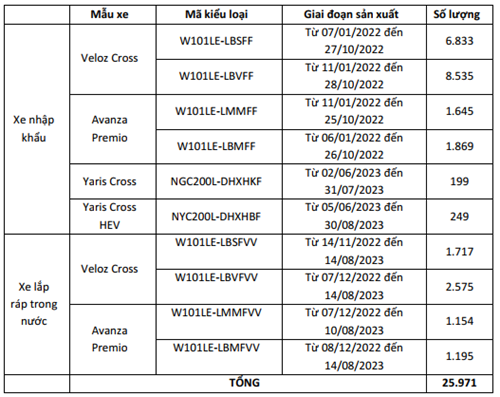 Chương trình sẽ được Toyota Việt Nam thực hiện chính thức từ ngày 19/01/2024 tại tất cả các Đại lý Toyota trên toàn quốc. Danh sách và số lượng xe tại Việt Nam bị ảnh hưởng cụ thể như sau: