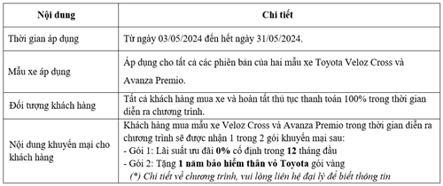 TOYOTA VIỆT NAM TRIỂN KHAI CHƯƠNG TRÌNH KHUYẾN MẠI CHO KHÁCH HÀNG MUA XE VELOZ CROSS & AVANZA PREMIO TRONG THÁNG 5/2024